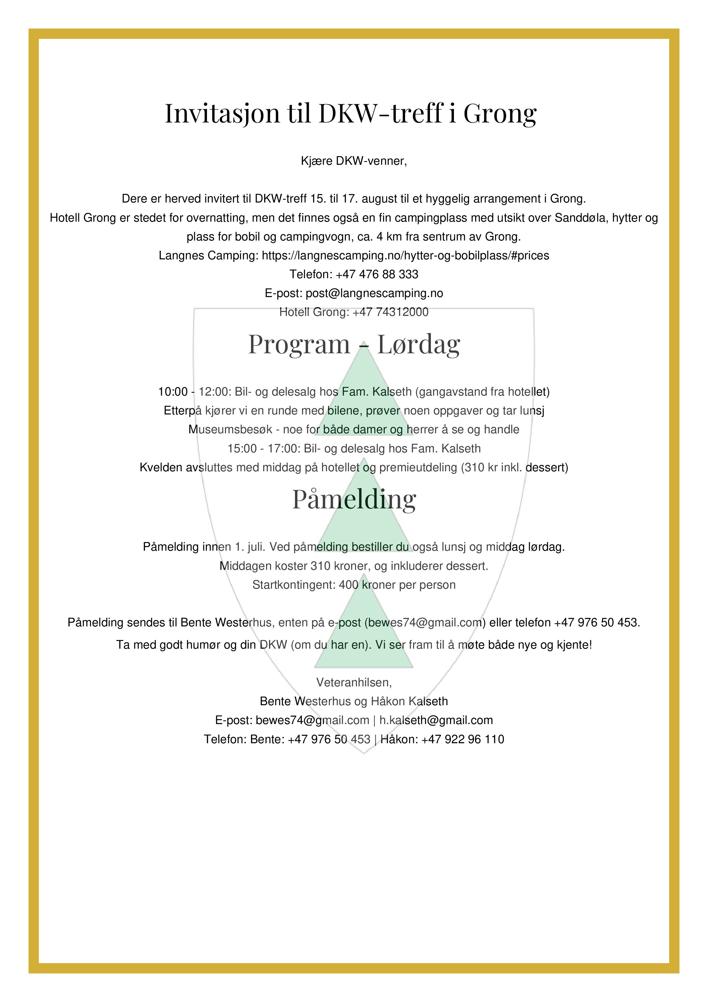 Årstreff 2026 Årets nasjonale DKW treff blir helgen 26-28 juni i Bud i Hustadvika. Hilsen Sivert og Sollaug Malmedal Les mer